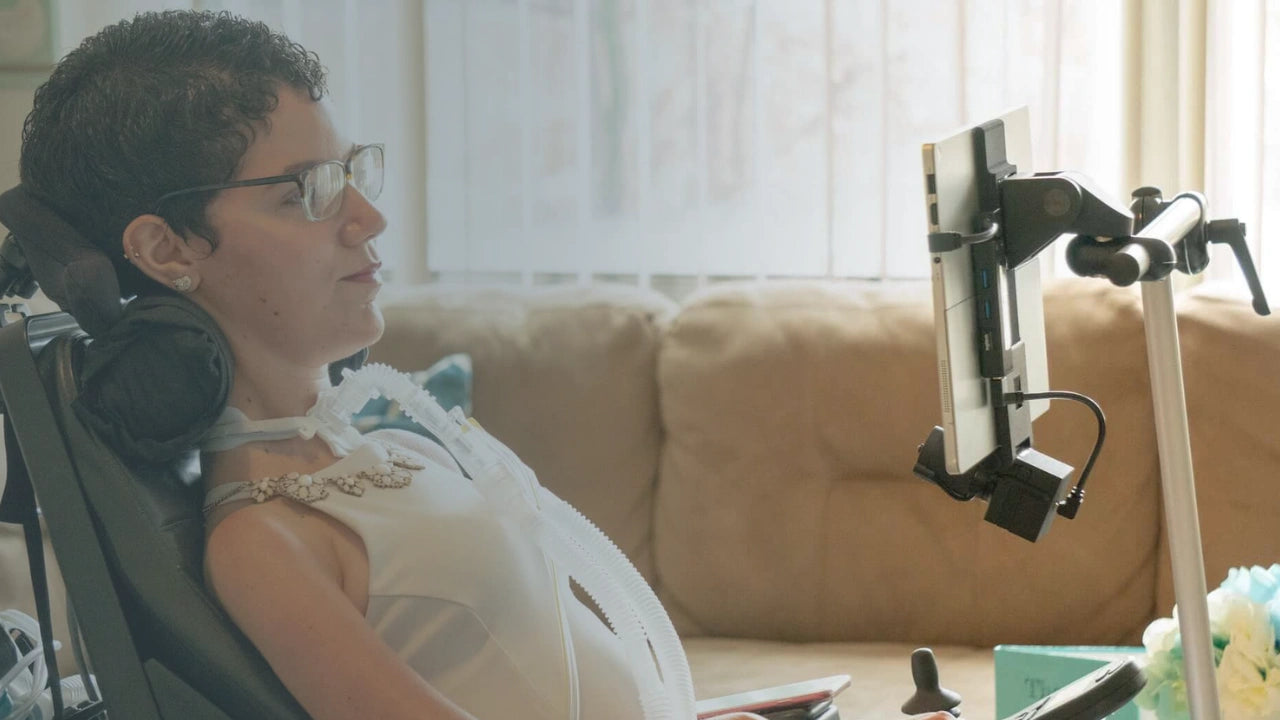 A special eye tracking camera mounted below the Eyegaze Edge screen observes one of the user’s eyes. Sophisticated image processing software analyzes the camera’s images 60 times each second and determines where the user is looking on the screen. Nothing is attached to the user’s head or body.