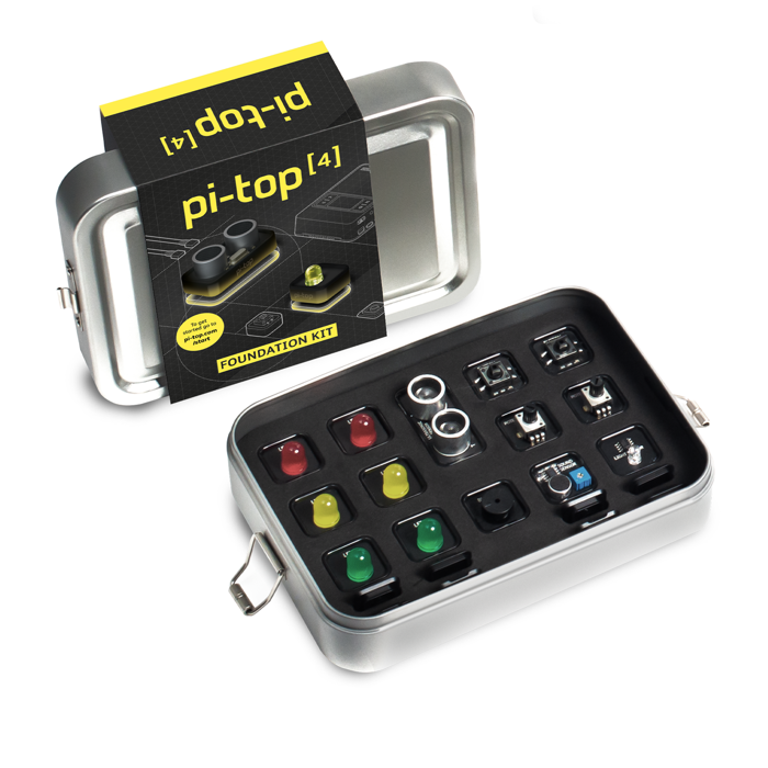 Every pi-top[4] comes with our Foundation Kit, containing 14 components including programmable sensors, buttons, LEDs, plus LEGO® connectors.